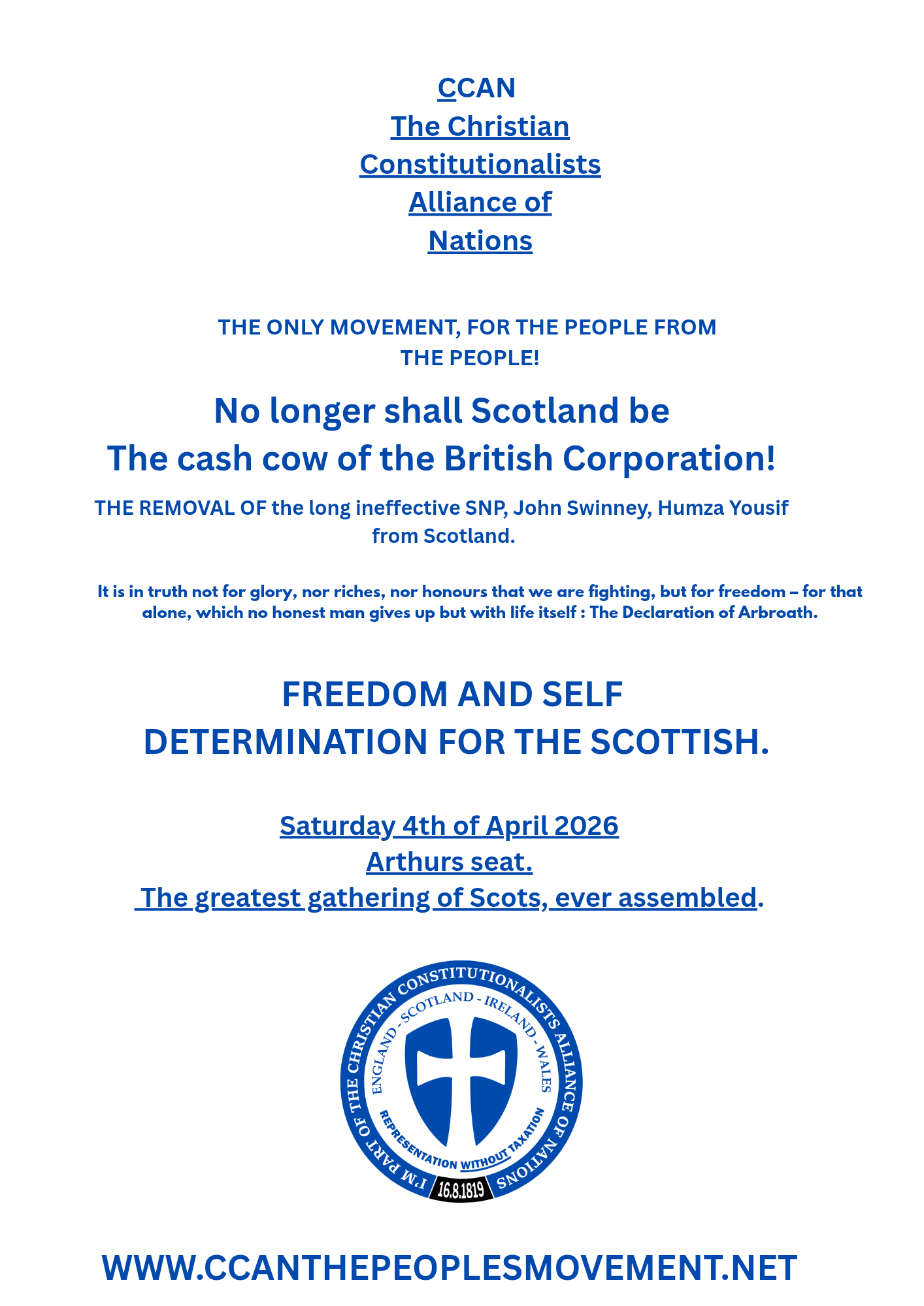 Scottish Independence supporters who don’t know, CCAN is the Christian Constitutionalist Alliance of Nations. It is a movement born out of the English Christian constitution party of England and Wales. CCAN’s purpose is to end British rule and influence on these islands, and return power to the people, of these proud historic nations. If that is to be achieved we must unite, to deny our political class the power to continue this fraud, theft, abuse and eradication of our culture, heritage and Christian values. CCAN is well aware of the other movements in Scotland trying to achieve independence and they must be supported, as CCAN believes Scotland is the key that can set our nations free. For the Unionists and the British, of course you will not agree, but just maybe you will get a bit angry, when you come to realise what has been stolen from you, your families, and the issues we face, whether it’s debt, NHS on it’s knees, the erosion of free speech and how you feel about immigration. These are all political choices designed by your British government and British parties. They are not accidental. So CCAN is a broad church of people who see there is no other road to travel than uniting against the oppressor and taking our God given rights back and our inheritance of these nation lands.